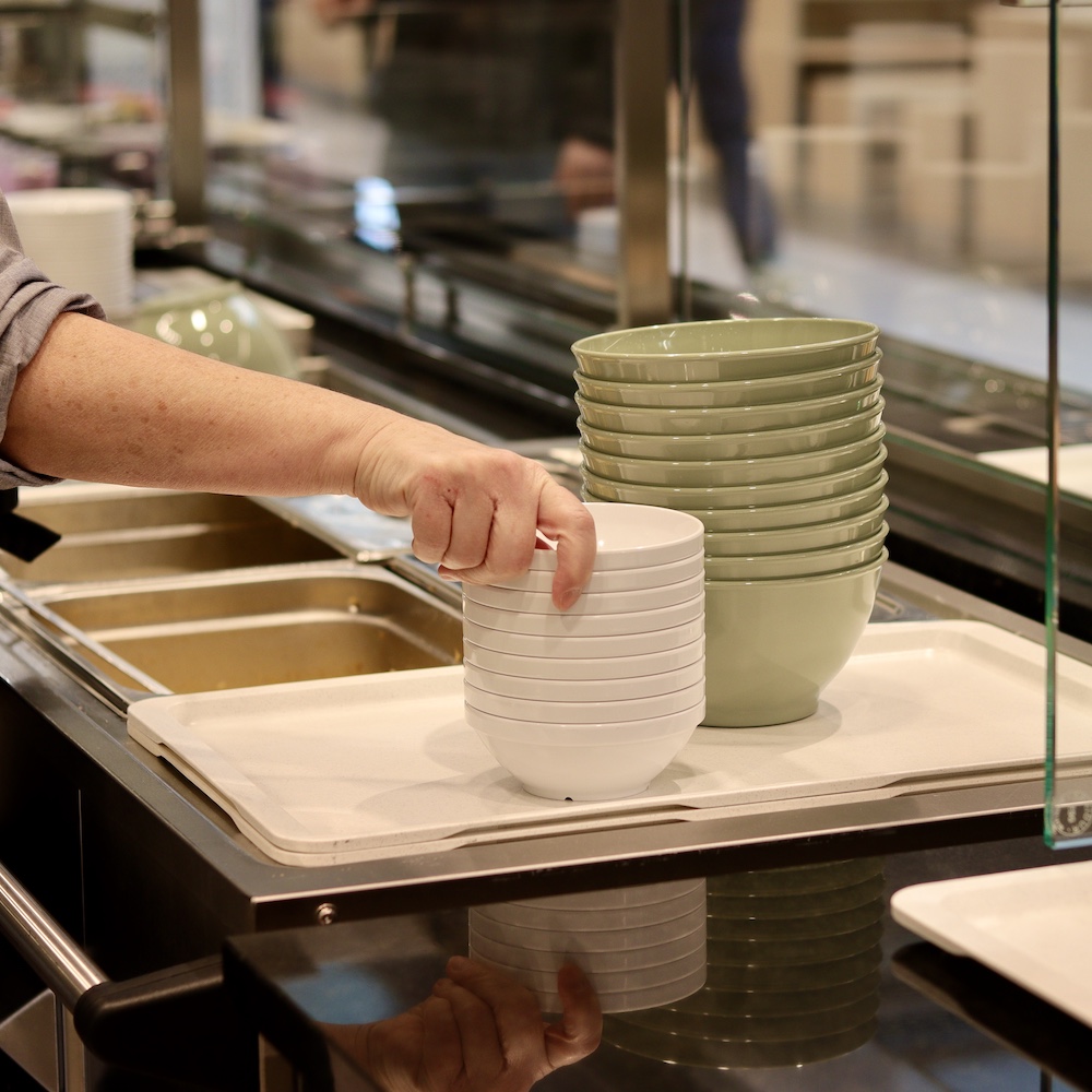 Die Neueröffnung der Mensa im Jahr 2025 steht für Veränderung: ein neuer Name, neue Räume und ein Konzept, das Funktionalität und Komfort vereint. Dazu gehört eine Geschirrlösung, die den Alltag spürbar erleichtert. Weniger Wärmeentwicklung in der Spülküche sorgt für ein angenehmes Klima und bessere Arbeitsbedingungen. Für Gäste und Mitarbeitende bedeutet das leichte Geschirr nicht nur einfaches Handling, sondern auch eine entspannte ruhige Atmosphäre.