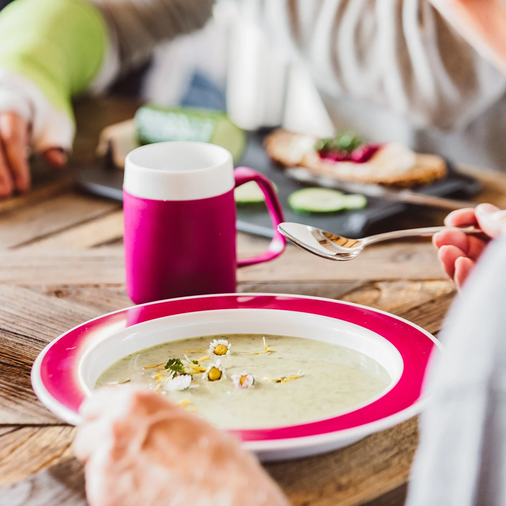 Movement difficulties, swallowing disorders (dysphagia), visual impairment or hemiplegia are often the consequences of a stroke and rob people of their independence when eating and drinking. Many of those affected feel marginalised or exposed by traditional care aids such as sippy cups. But there is another way: the specially developed ORNAMIN stroke tableware enables people living with disabilities to eat and drink independently thanks to its integrated assistive functions and also serves as a valuable support for carers in everyday life.